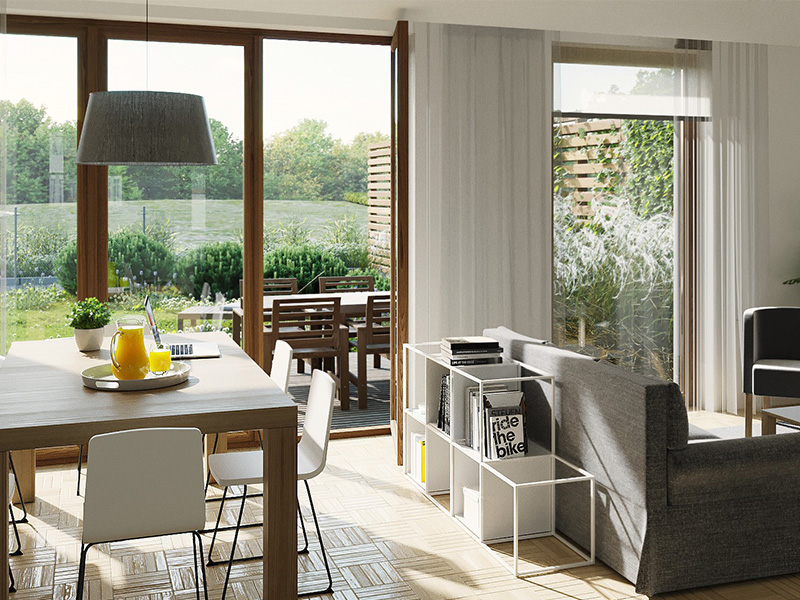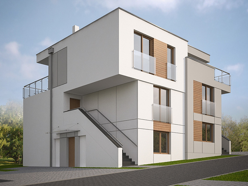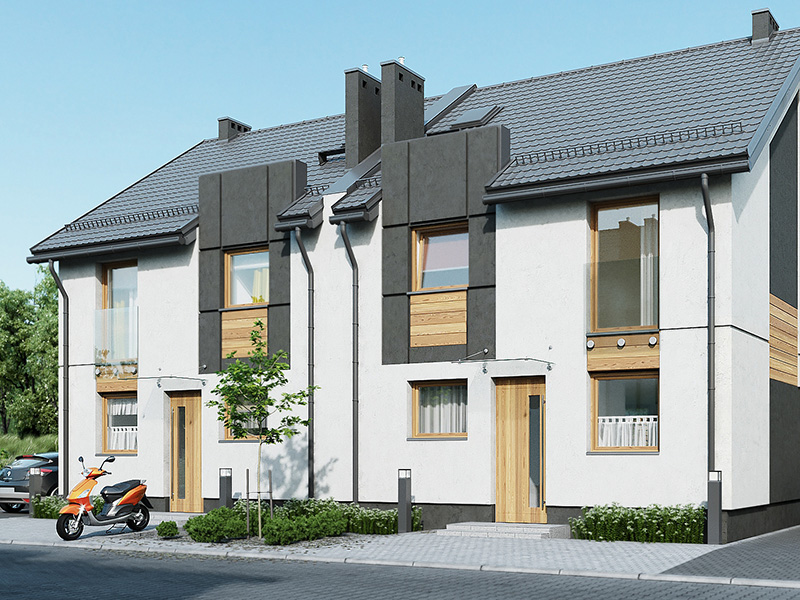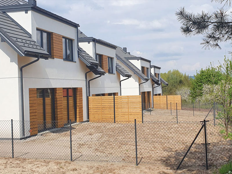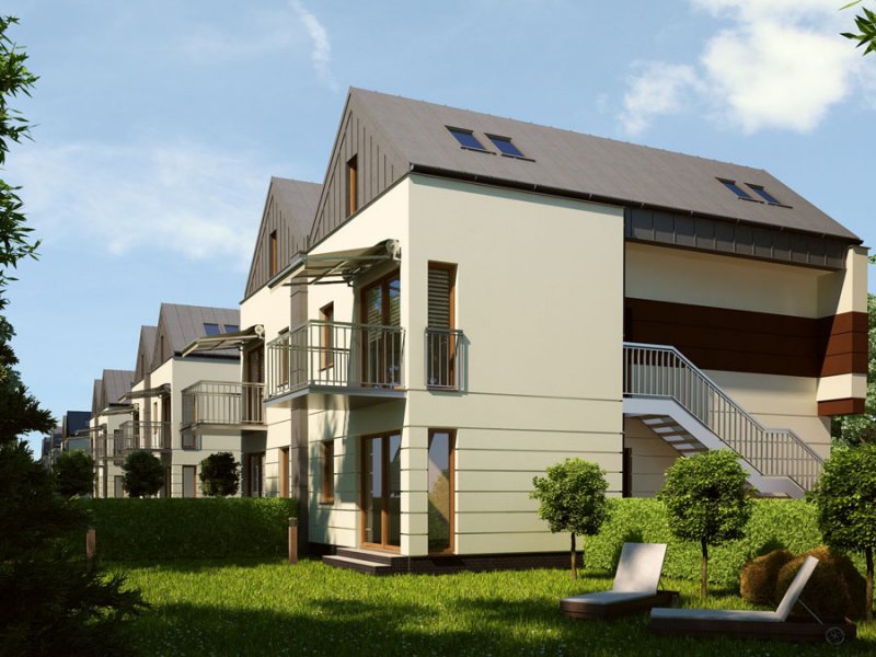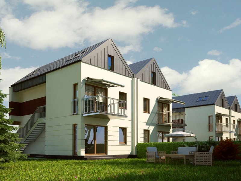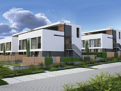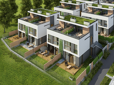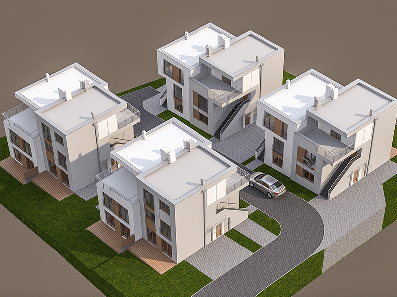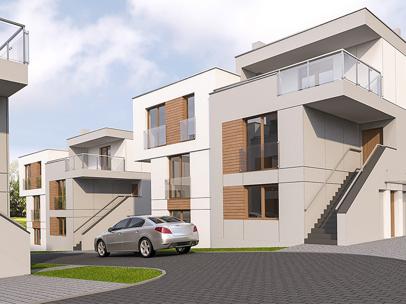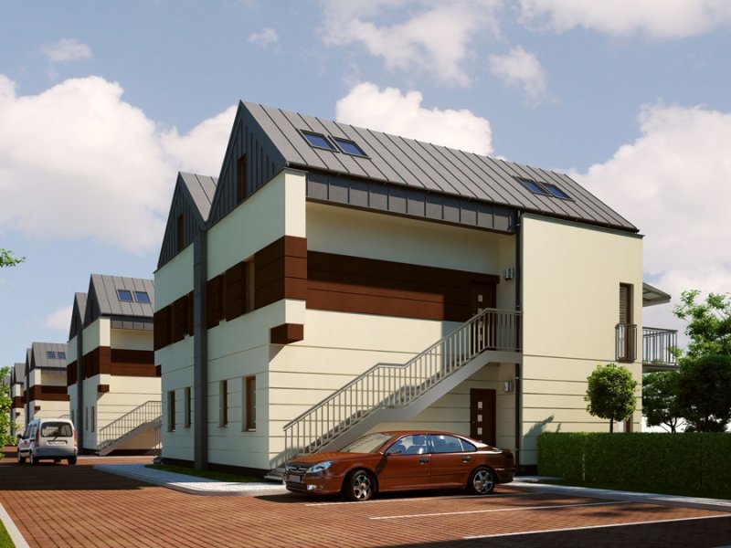 Zespół 64 mieszkań zaprojektowanych w nowoczesnych, modernistycznych segmentach bliźniaczych wraz z infrastrukturą techniczną, parkingami i drogą wewnętrzną