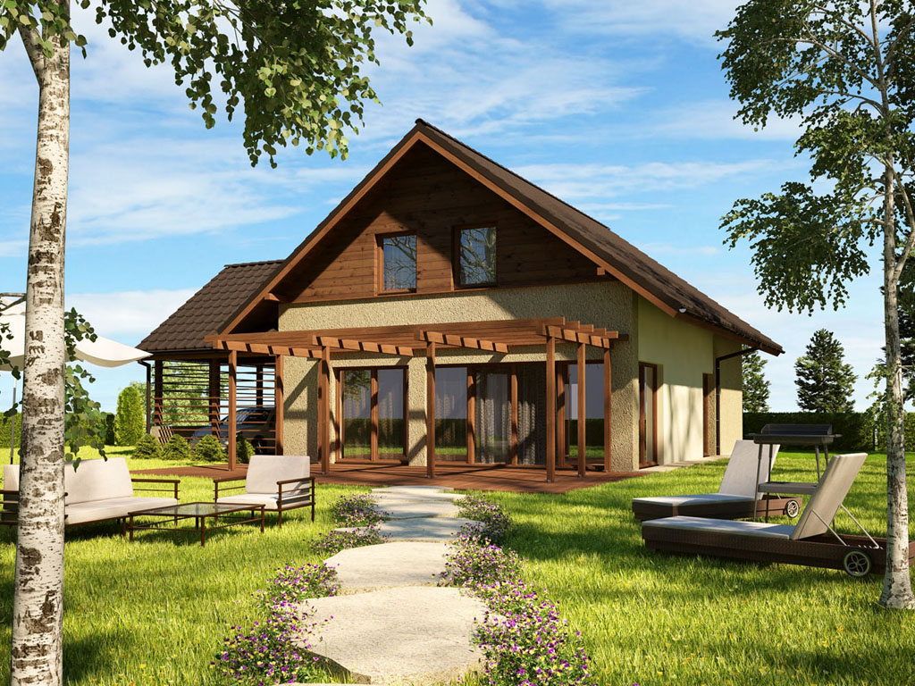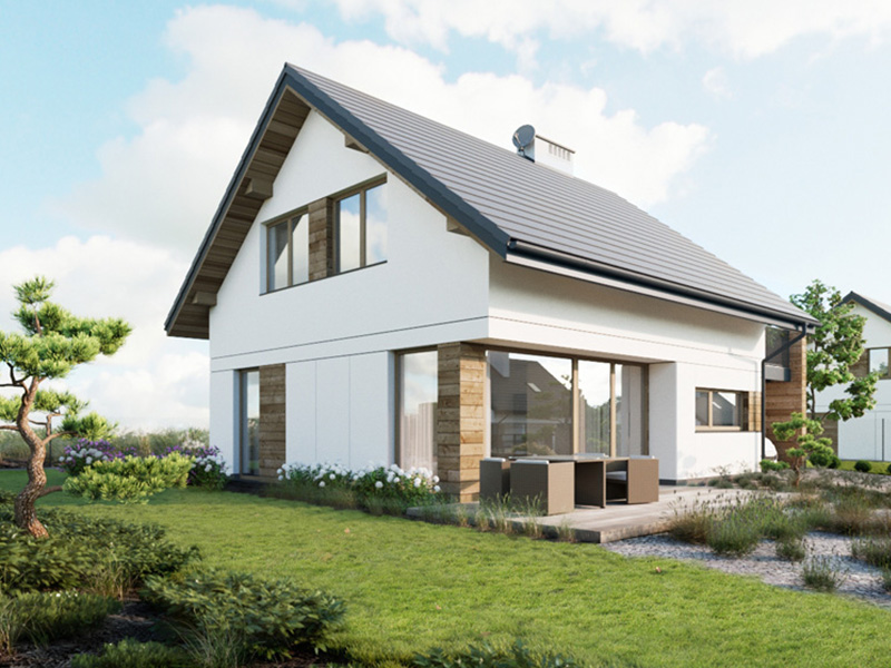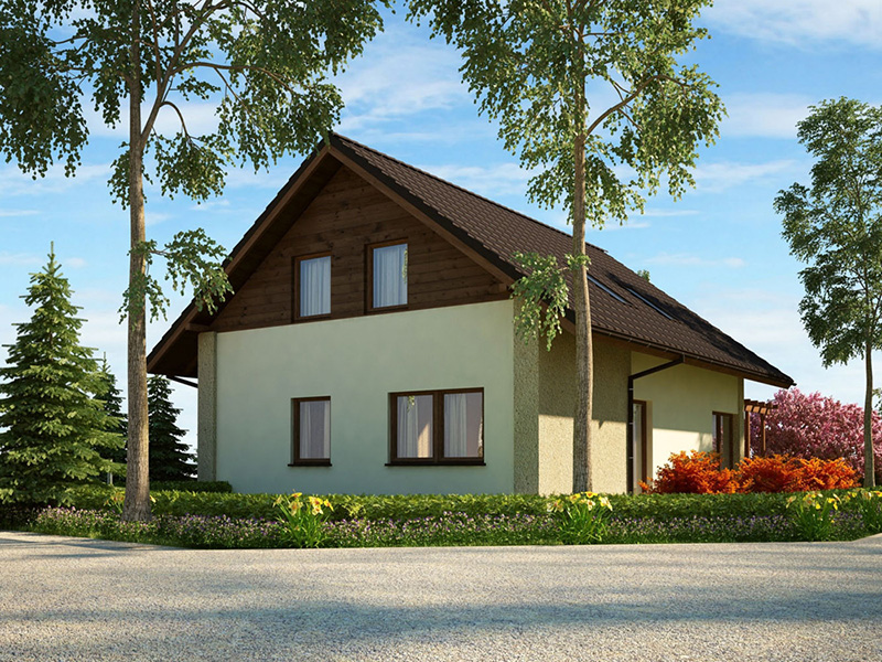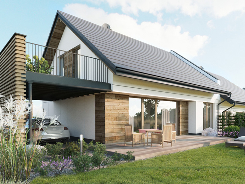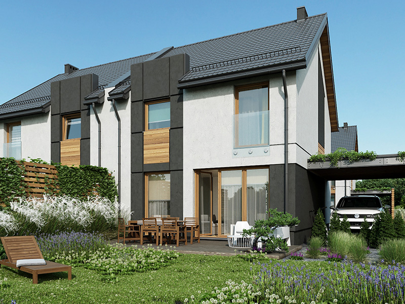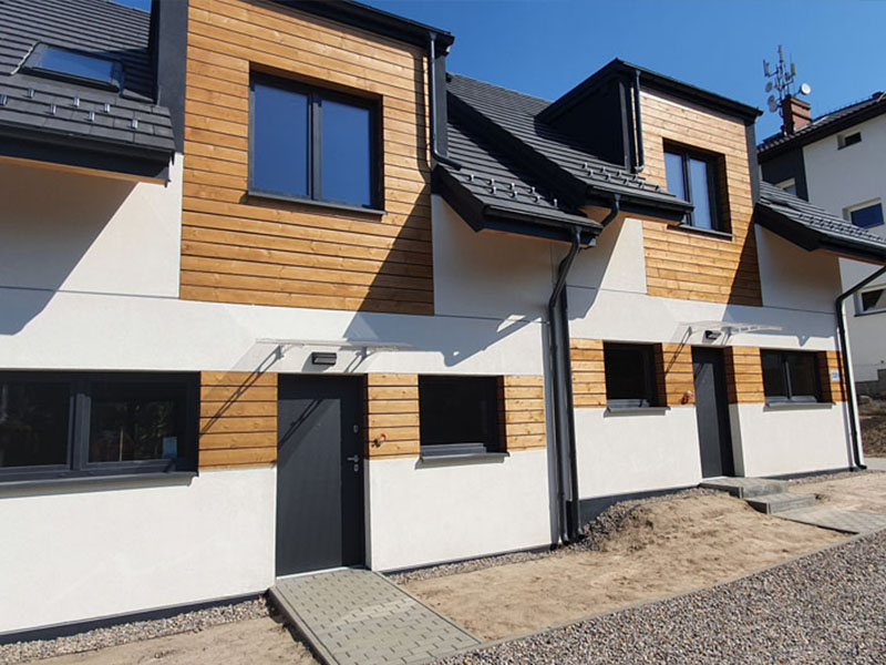 Zabudowa jednorodzinna bliźniacza. Mieszkanie 2-pokojowe na parterze, mieszkanie 3-pokojowe na pierwszym piętrze i poddaszu.